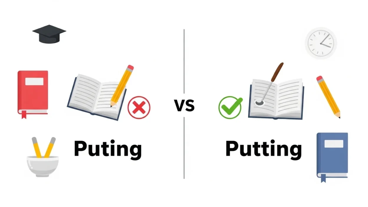 The confusion between puting vs putting is very common, but the rule is simple. Putting is the correct spelling and represents the present participle or gerund form of the verb put, meaning to place something somewhere.